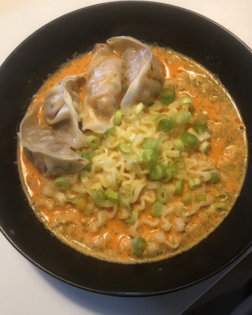 - Rør æggeblomme, pulver og sovs fra nudel pakken sammen i en skål og tilsæt vand fra nudlerne
