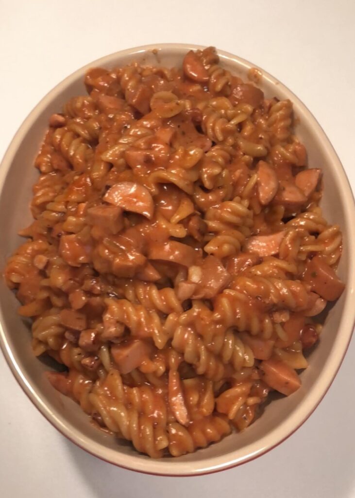- tilsæt tomatpuré, oma madlavningsfløde og 3-4 dl pastavand