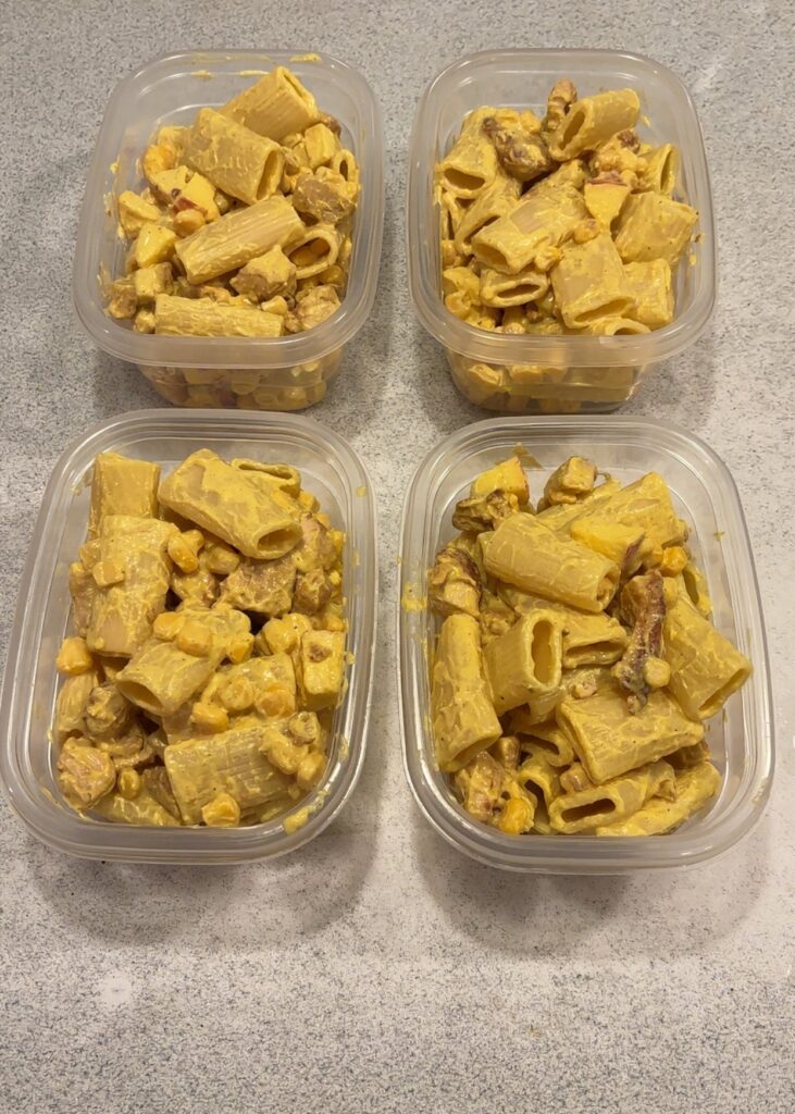 - bland majs, æbler, pastaen og kyllingen i dressingen