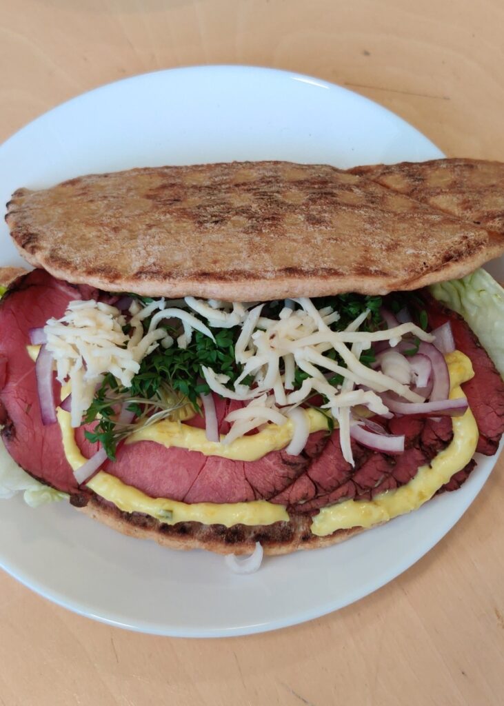 90 g ægte græsk fladbrød, fuldkorn15 g hjertesalat70 g roastbeef15 g remoulade light12 g rødløg5 g revet peberrod