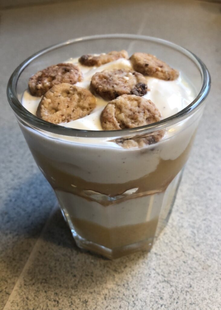 - Læg skiftevis æblemos, skyr og knuste makroner sammen i et glas